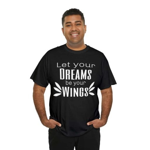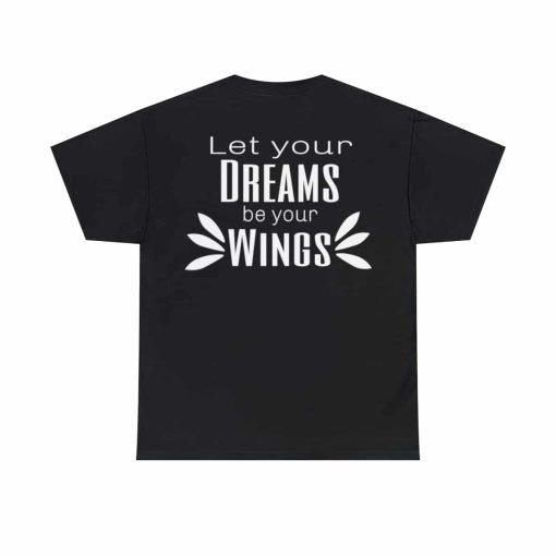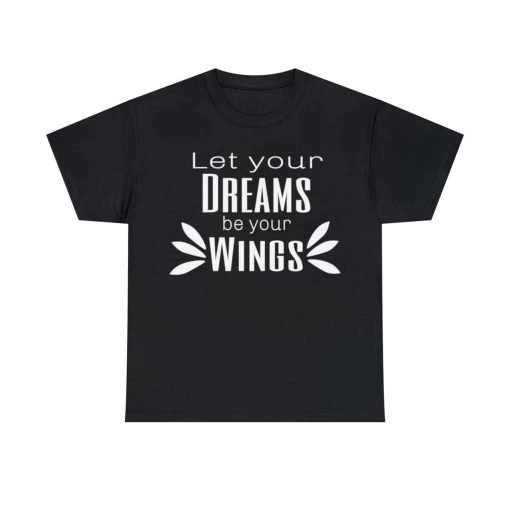 Dream big, and wear it too! Our Cotton Tee With Saying for Dreamers is designed to uplift and inspire you every time you put it on. With its elegant white typographic design that reads, “Let your dreams be your wings,” this tee is more than just a fashion choice—it’s a daily dose of motivation! ????