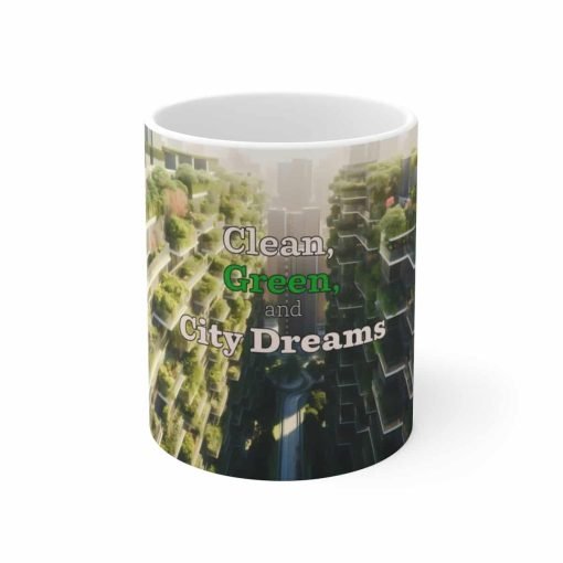 Start your day right and in style with our Sustainable Cityscape Ceramic Mug. This isn’t just a regular mug, it’s a statement piece that effortlessly blends functionality with a strong message about sustainability and urban living. This trendy ceramic mug features a catchy green urban saying that not only adds a dash of style to your morning coffee or tea routine but also sparks conversations about sustainable living.