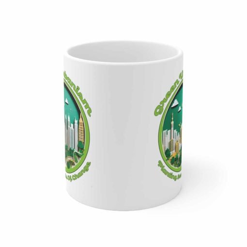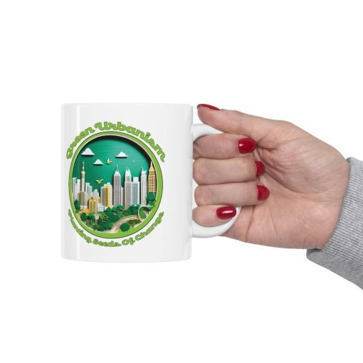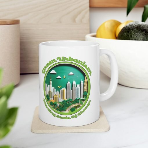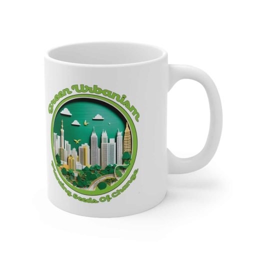 The Green Urbanism Ceramic Coffee Mug features an eye-catching illustration of a city skyline surrounded by flourishing greenery. The design symbolizes the harmonious integration of nature and urban development, emphasizing the need for sustainable and eco-friendly practices in our cities. ????️????