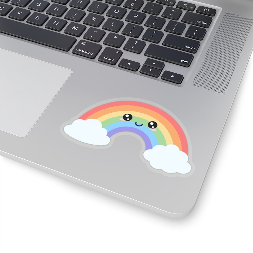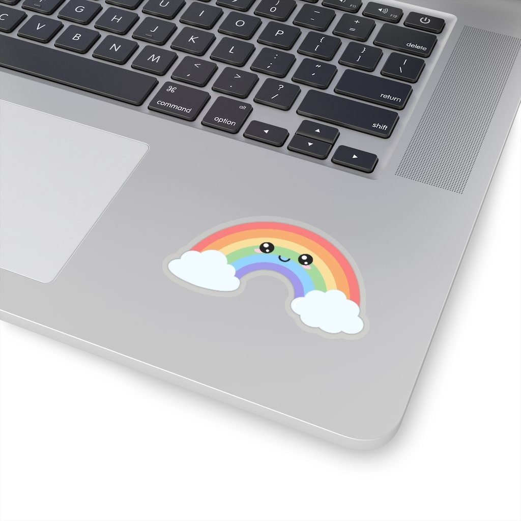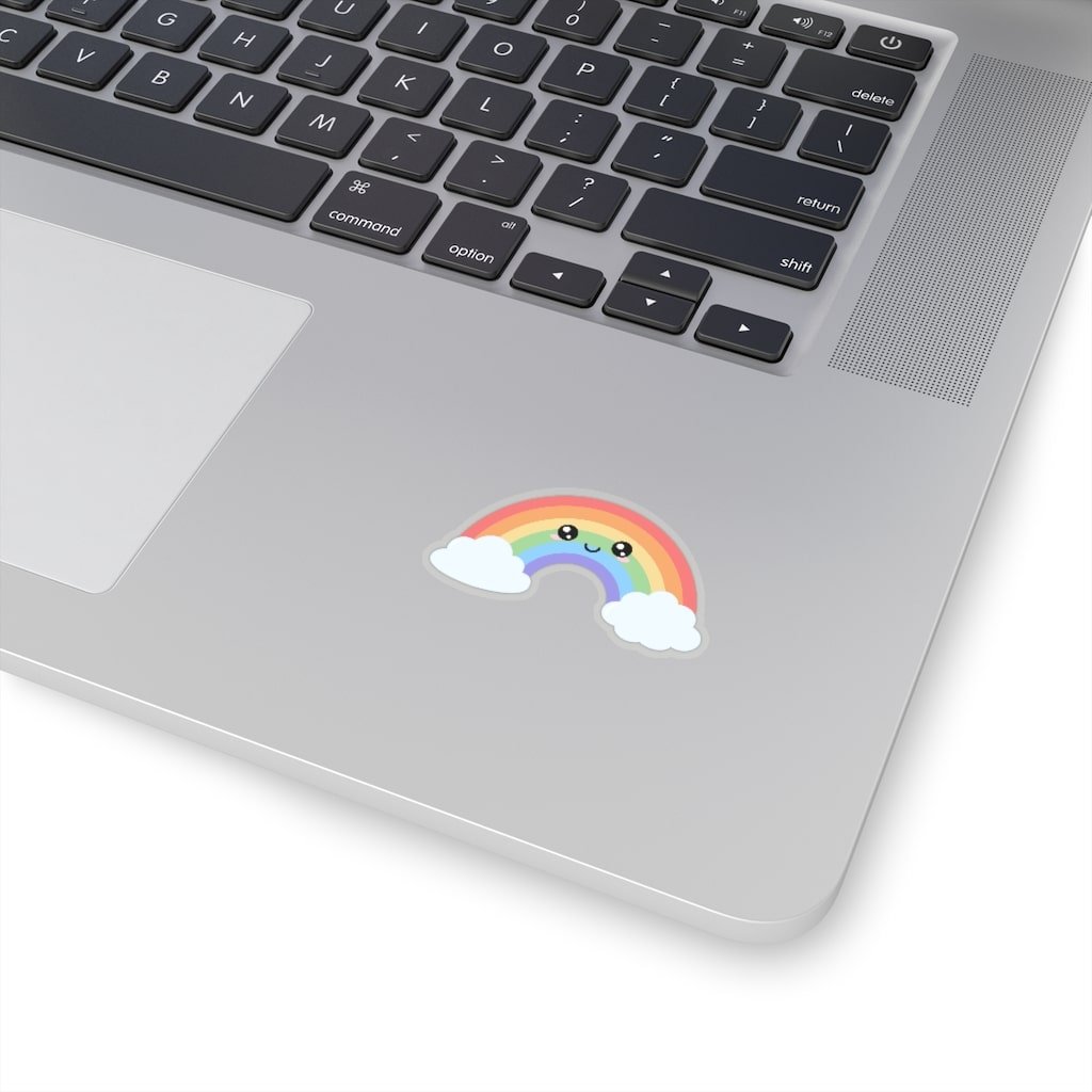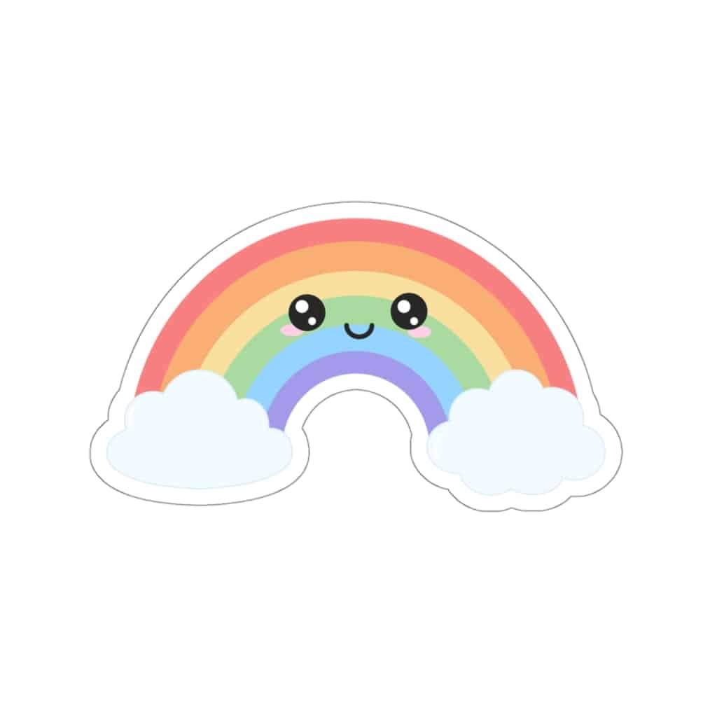 Happy Rainbow Stickers help you add some happiness and color to your day! These stickers feature a smiling rainbow emerging from two clouds. They’re durable because they’re 100% vinyl with 3M glue. Choose between four convenient sizes. The Happy Rainbow Stickers are white or transparent and have a grey adhesive left side for white stickers.