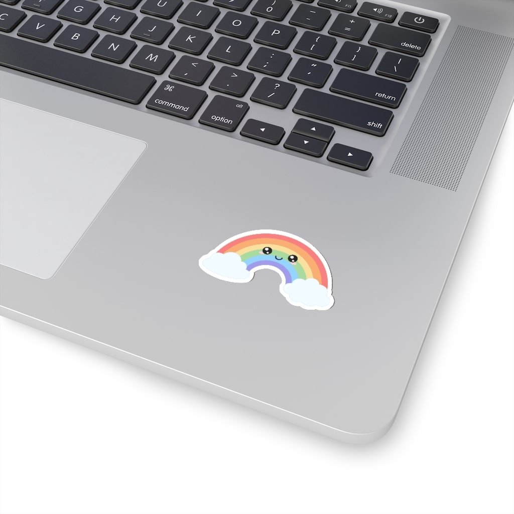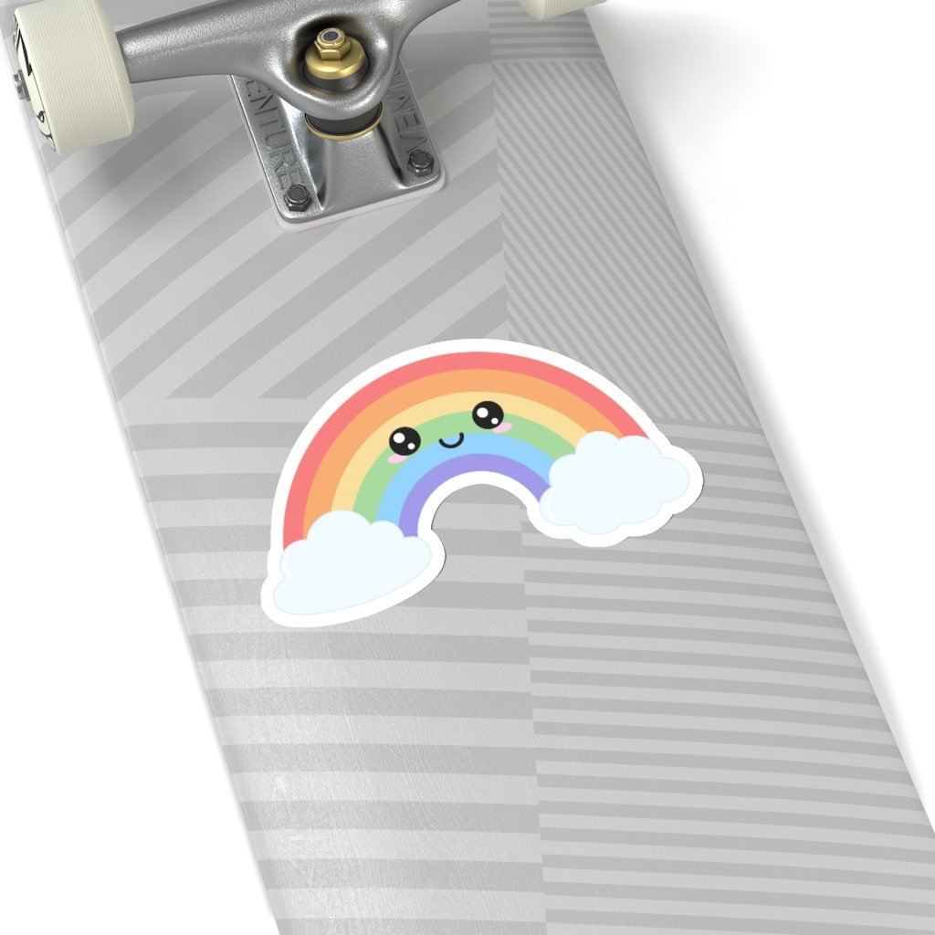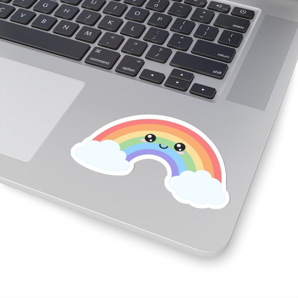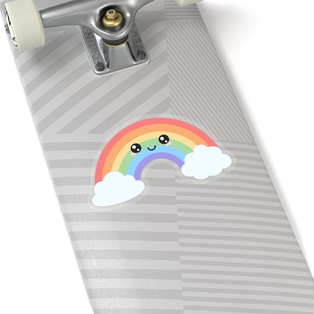 Happy Rainbow Stickers help you add some happiness and color to your day! These stickers feature a smiling rainbow emerging from two clouds. They’re durable because they’re 100% vinyl with 3M glue. Choose between four convenient sizes. The Happy Rainbow Stickers are white or transparent and have a grey adhesive left side for white stickers.