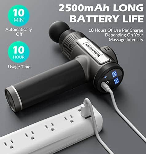 - Massage Gun: Super-long standby. Equipped with 2500mAh high-quality lithium-ion battery, lasts from 6-10 hours massage use on a single charge.