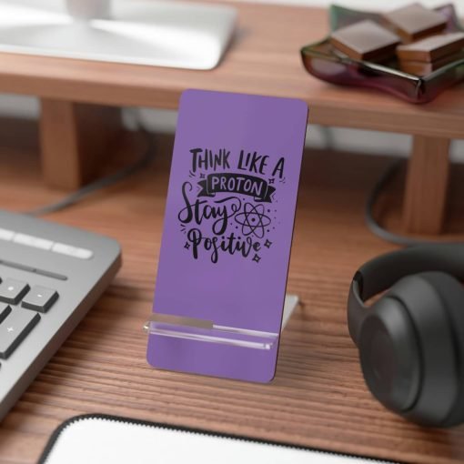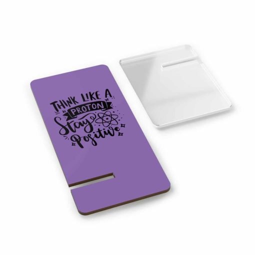 Discover a delightful fusion of function and inspiration with our “Think Like A Proton Stay Positive” Smartphone Upright Stand. This standout piece not only adds a pop of charming purple to your workspace or travel kit but also serves as a steadfast supporter of your digital viewing needs.